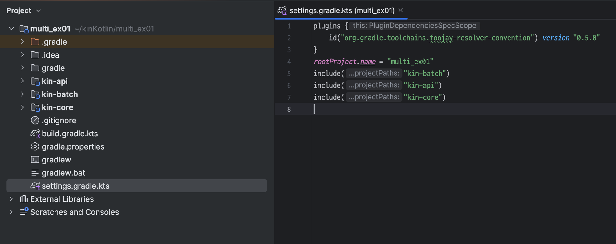 - group = "com.kin": 프로젝트의 그룹 식별자를 설정합니다. 보통은 회사 또는 조직의 도메인을 역순으로 사용합니다.