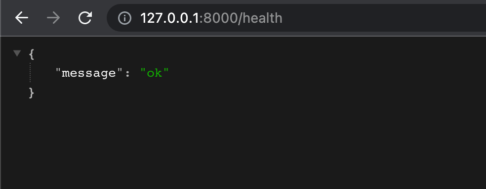 http://127.0.0.1:8000/health URL 로 접근합니다. 접근하면 아래와 같이 의도한 응답이 내려졌음을 확인할 수 있습니다.