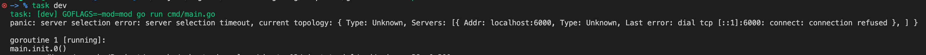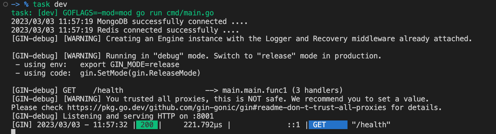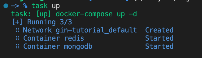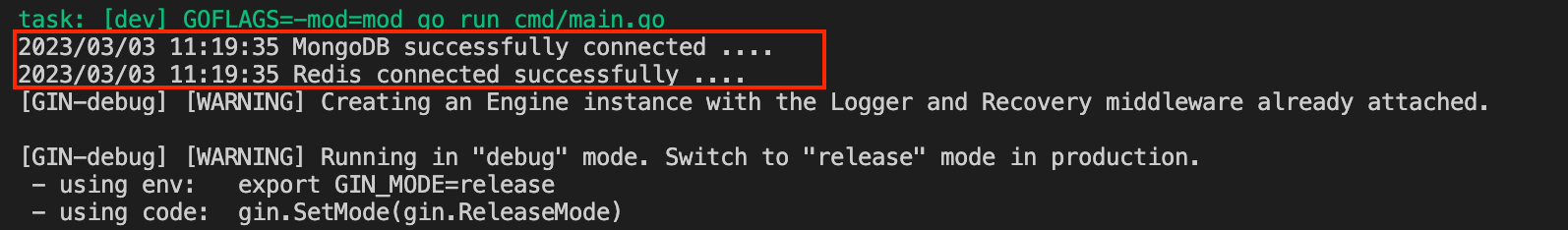 컨테이너가 잘 세팅이 되었으므로 정상적으로 실행되는 것을 기대할 수 있습니다. 다시 task dev 명령어를 실행해보면 init 함수에서 정의한 로깅이 잘 출력되는 것을 확인할 수 있어 프로그램이 정상적으로 실행됨을 확인하였습니다. 또한, main 함수 실행 전에 mongodb, redis 연결을 미리 진행하기에 깔끔한 로직 전개가 이루어졌습니다.