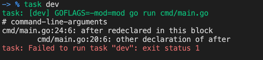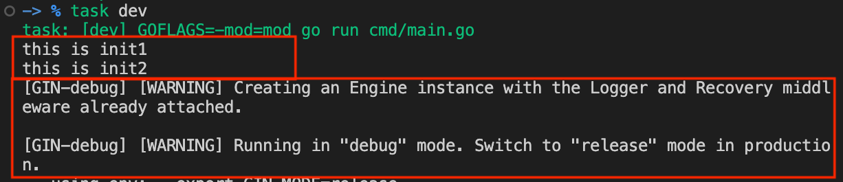 task dev 명령어를 통해서 실행하면 아래의 그림과 같이 정의된 init 함수가 모두 실행되고 main 함수내에 정의된 로직이 실행됩니다.