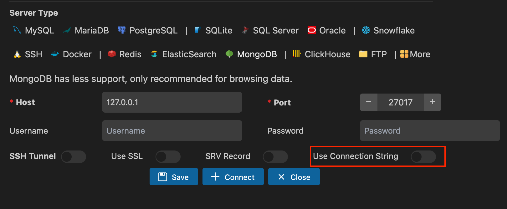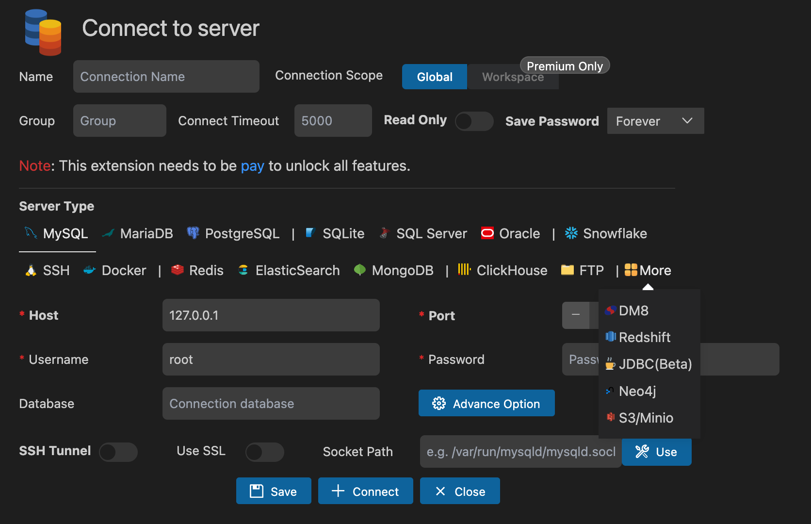 MySQL, MariaDB, PostgreSQL, SQLite, Redis, MongoDB, ElasticSearch, SQL Server, Snowflake, Oracle, ClickHouse, FTP, Docker, SSH, DM8, RedShift, JDBC, Neo4j, S3/Mino Connection extension for Visual Studio Code!