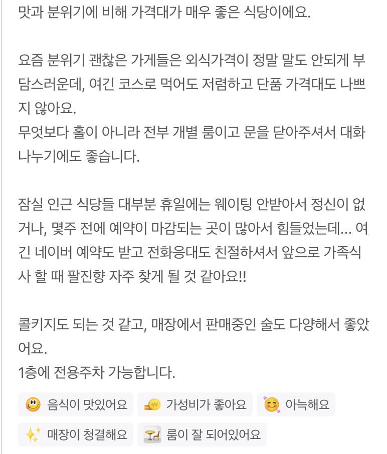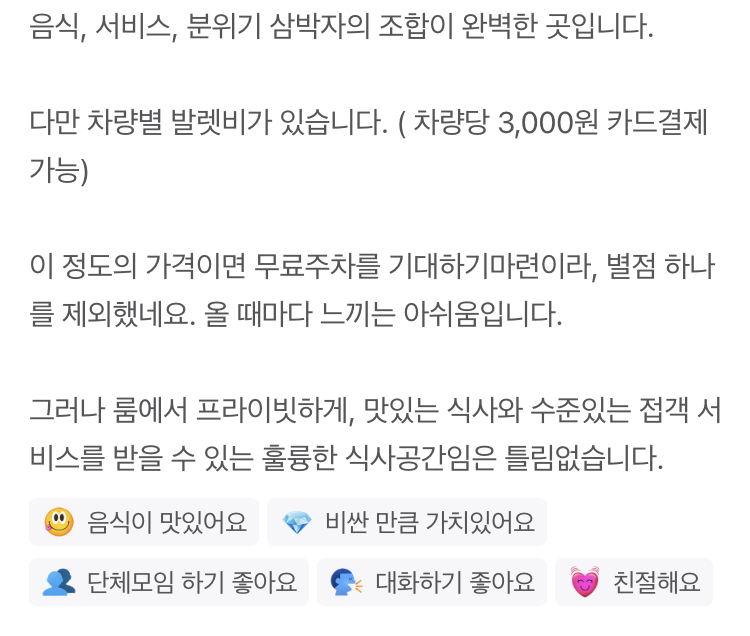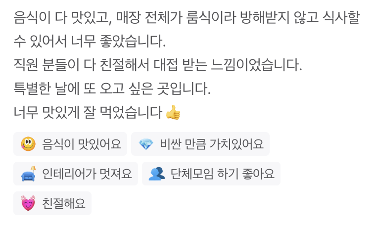 - 키워드: 맛있다, 친절하다, 인테리어가 좋다, 단체모임하기가 좋다