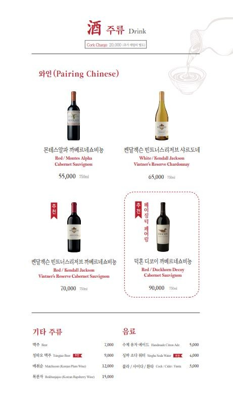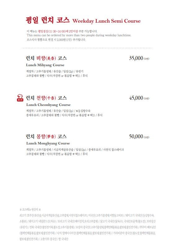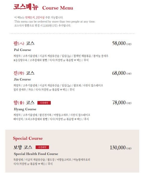 코스 요리의 음식과 순서도 적절하기에 진 코스를 추천드립니다. (향 코스는 사전 예약이 필요합니다)