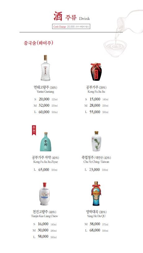 - 고량주: 연태고량주, 공부가주, 죽엽청주, 양하대곡, 천진고량주 등