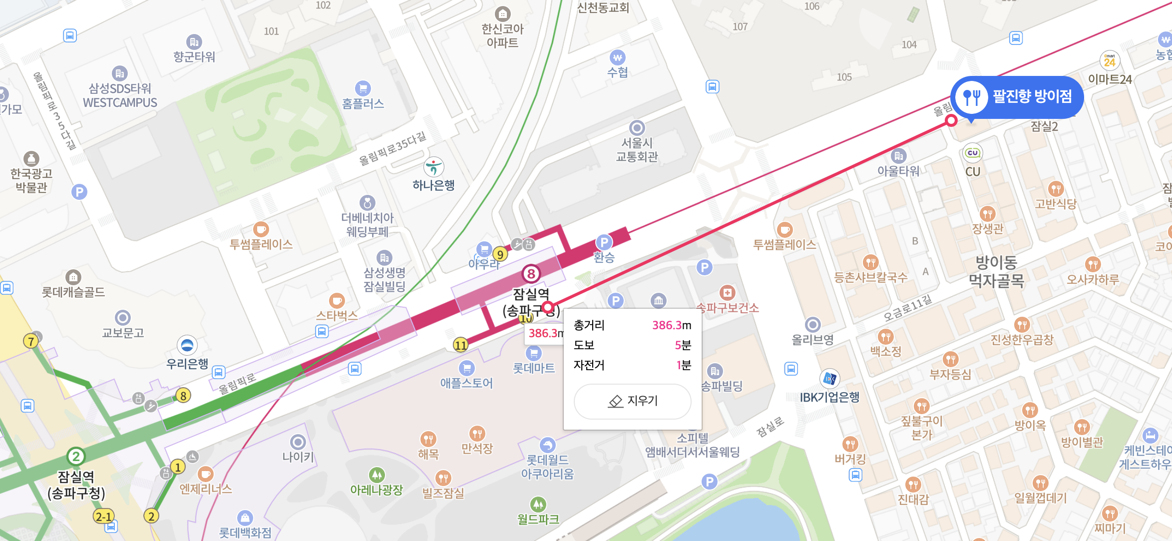 마지막으로 잠실에서 방이점으로 향하는 대로는 상대적으로 주말 인파가 적은점에 있어서 어른들이 이동하기 용이하다고 판단했습니다.