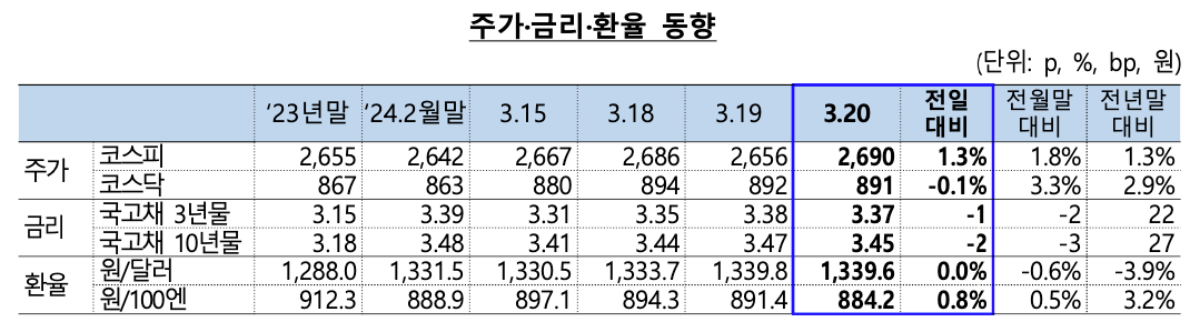 요약: 주가는 기관·외국인 매수세 유입으로 상승. 금리는 전일 미 국채금리 움 직임 등에 영향받아 하락. 환율은 FOMC 경계감 등으로 보합.