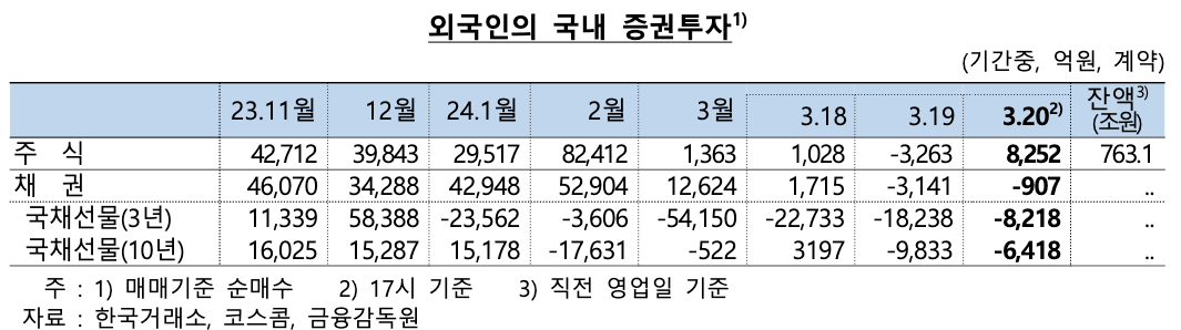 ✅ 외국인 증권투자 : 주식 순매수(+8,252억원*), 채권 순매도(-907억원**)