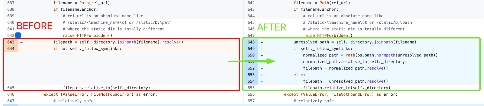 그런데 이번 취약점을 통해서 follow_symlinks 옵션을 True로 설정하면 주어진 파일 경로가 루트 디렉터리 내외부에 있는지 확인하는 유효성 검사 코드가 누락되어 있음이 밝혀졌습니다. 이로 인해 디렉터리 경로를 제어할 수 있는 취약점이 발생할 수 있으며 시스템에서 임의의 파일을 무단으로 엑세스가 가능함이 알려졌습니다.