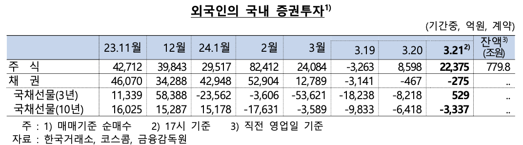 ✅ 외국인 증권투자 : 주식 순매수(+22,375억원*), 채권 순매도(-275억원**)