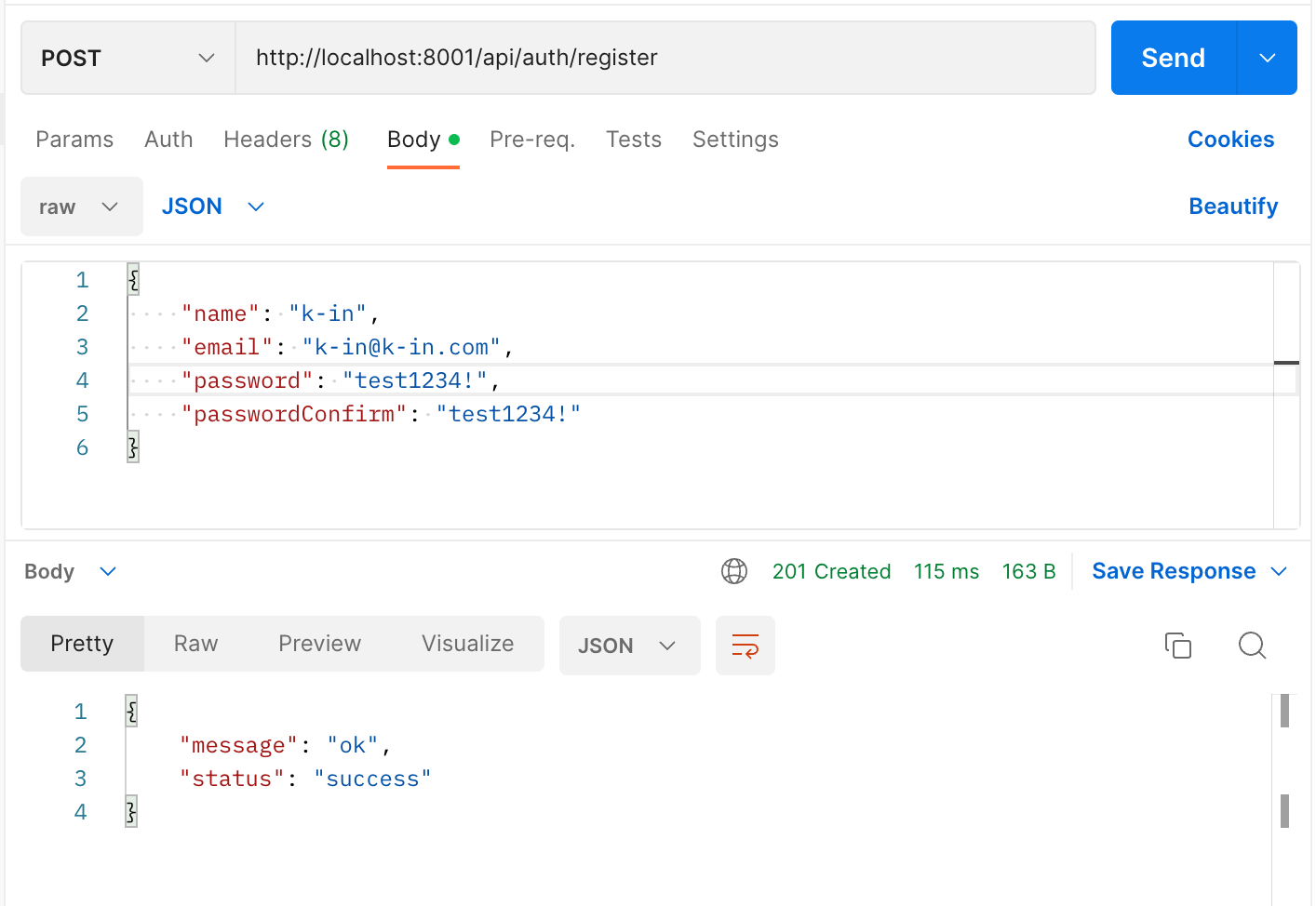 Postman 혹은 테스터 도구를 통해 회원가입이 정상적으로 가능한지 확인해보겠습니다.