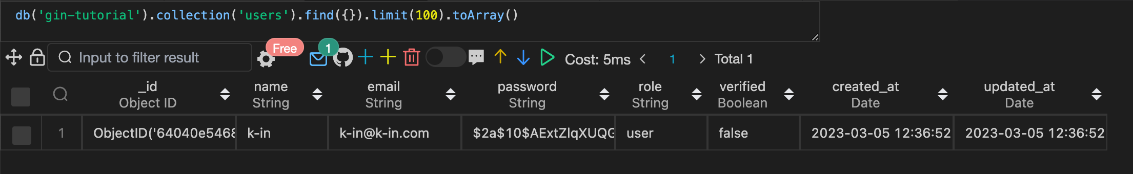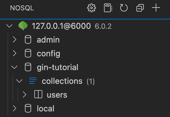 데이터 베이스에도 gin-tutorial 이라는 DB 가 생성되었고 users 라는 컬렉션도 잘생성되었습니다.