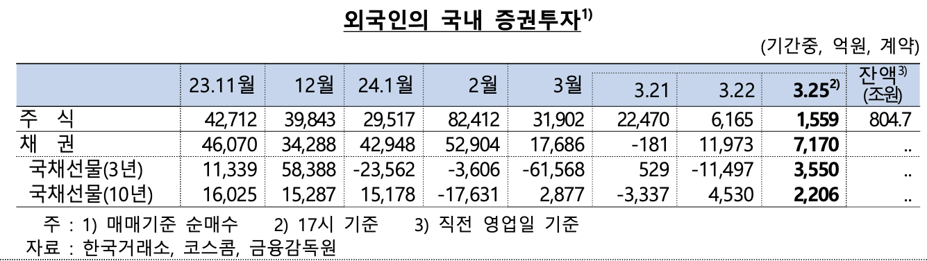 📈 외국인 증권투자 : 주식 순매수(+1,559억원*), 📉 채권 순매도(-7,170억원**)