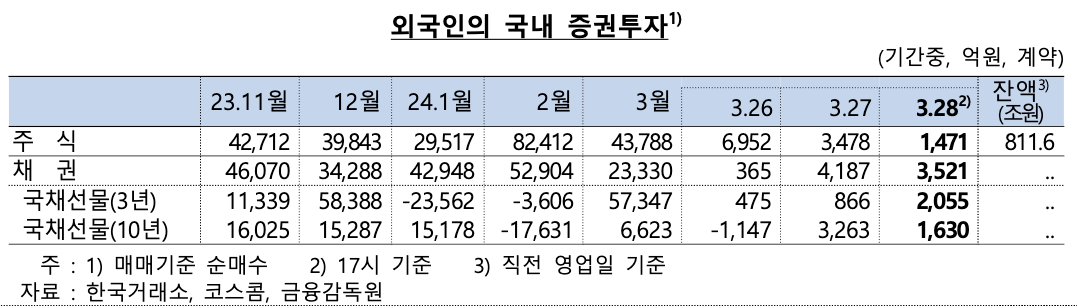 📈 외국인 증권투자 : 주식 순매수(+1,471억원*), 채권 순매수(+3,521억원**)