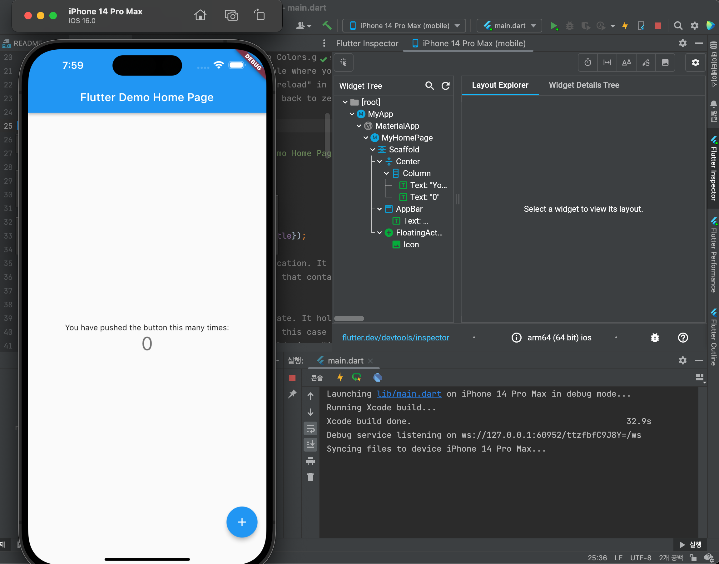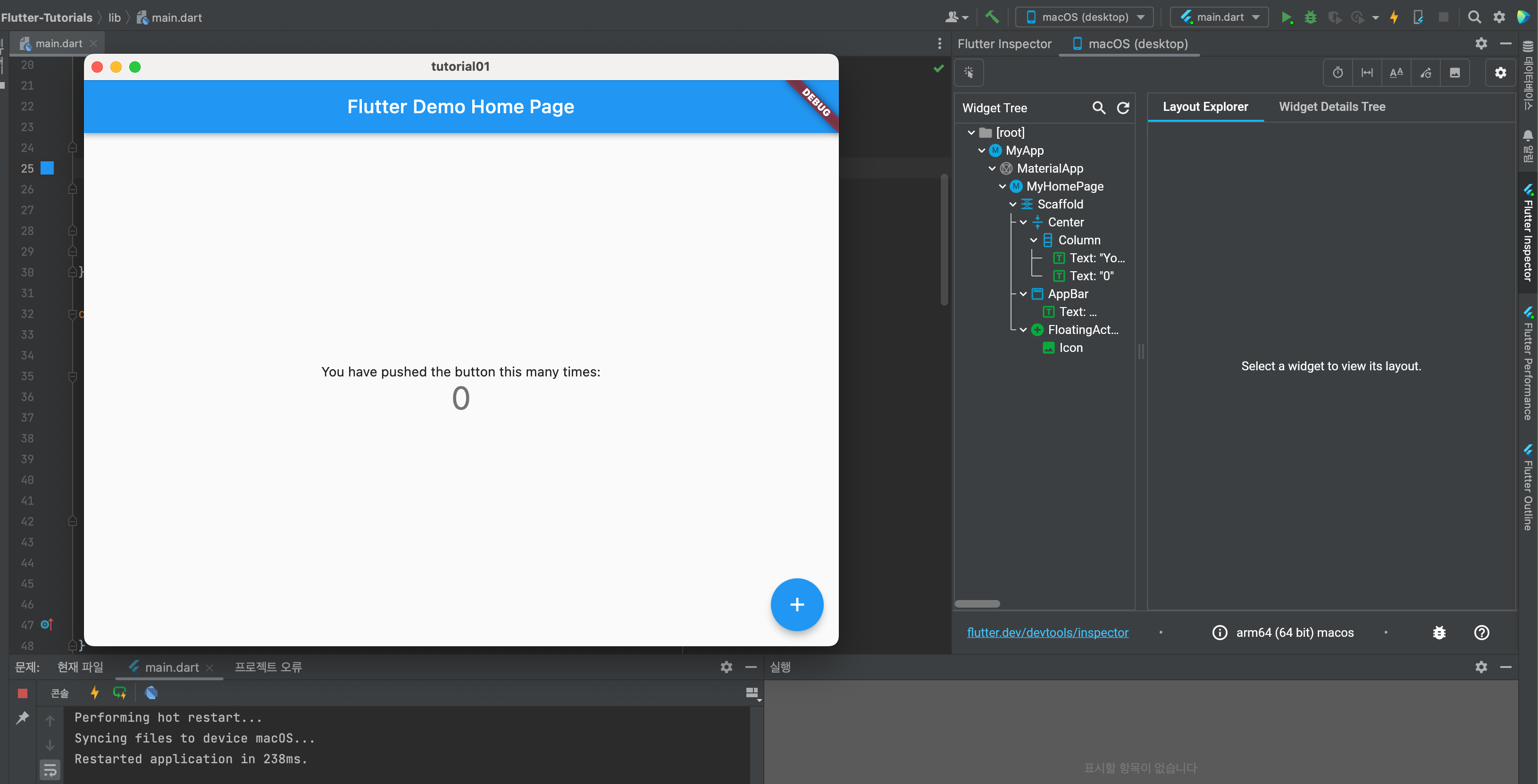 플러터를 실행하면 좌측 패널에 "Flutter Inspector", "Flutter Performance", "Flutter Outline" 등의 추가 설정 창이 생성됩니다.