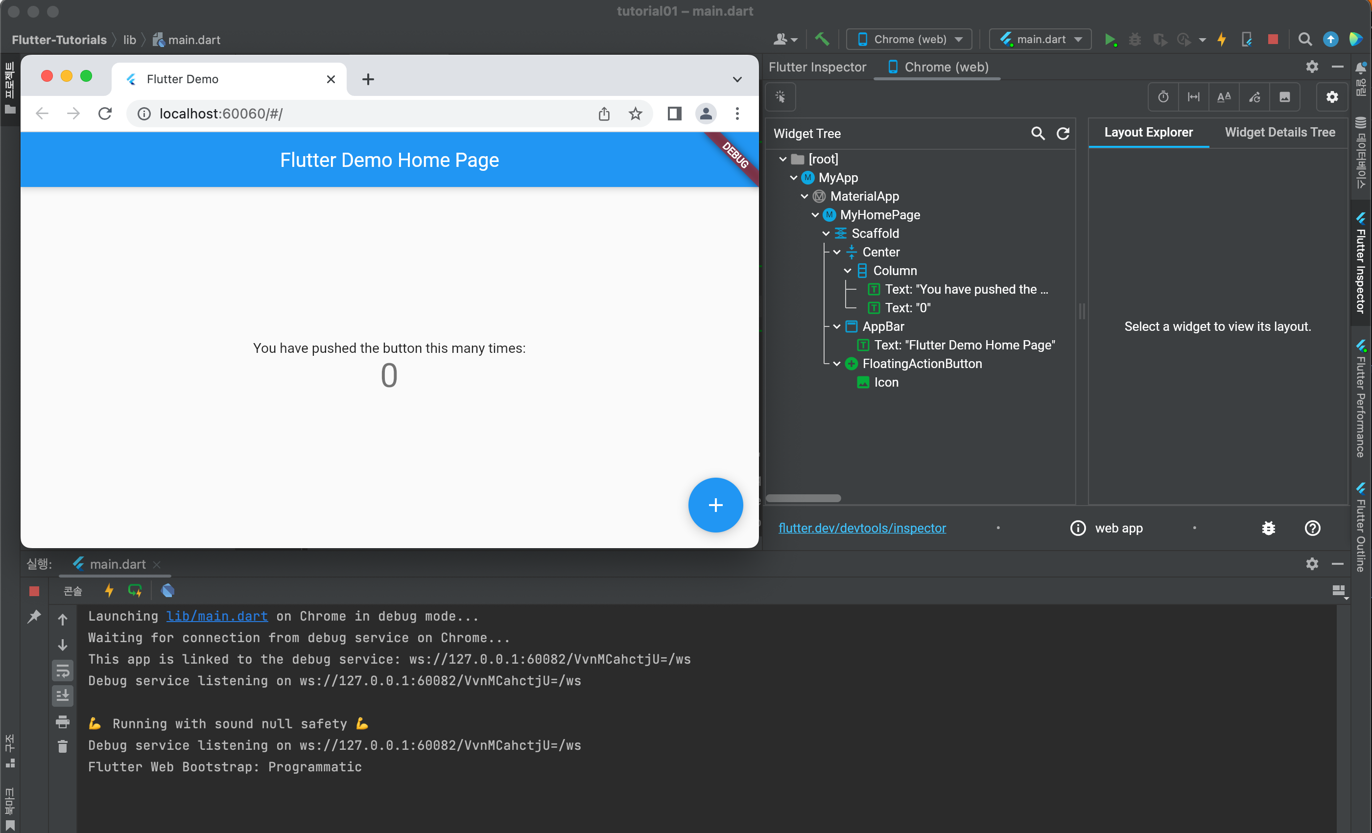 일단 만만한 WEB 환경으로 빌드를 해봅시다. 빌드에 몇초면 충분합니다. 참고로 이전 글에서 Flutter 는 다트 언어로 개발한다고 하였습니다. 그런데 웹에서도 잘만 실행됩니다.