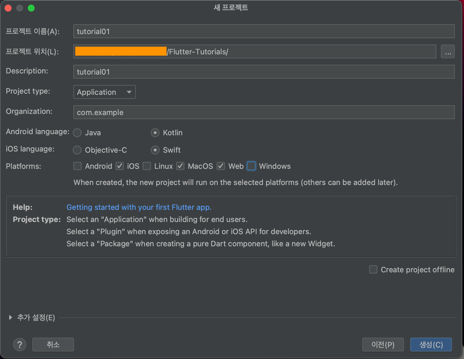 과감하게 iOS, MacOS, Web 만 선택해주고 나머지는 제외해주세요! 나중에 필요할 때 얼마든지 추가가 가능하니 걱정 안해도 됩니다!