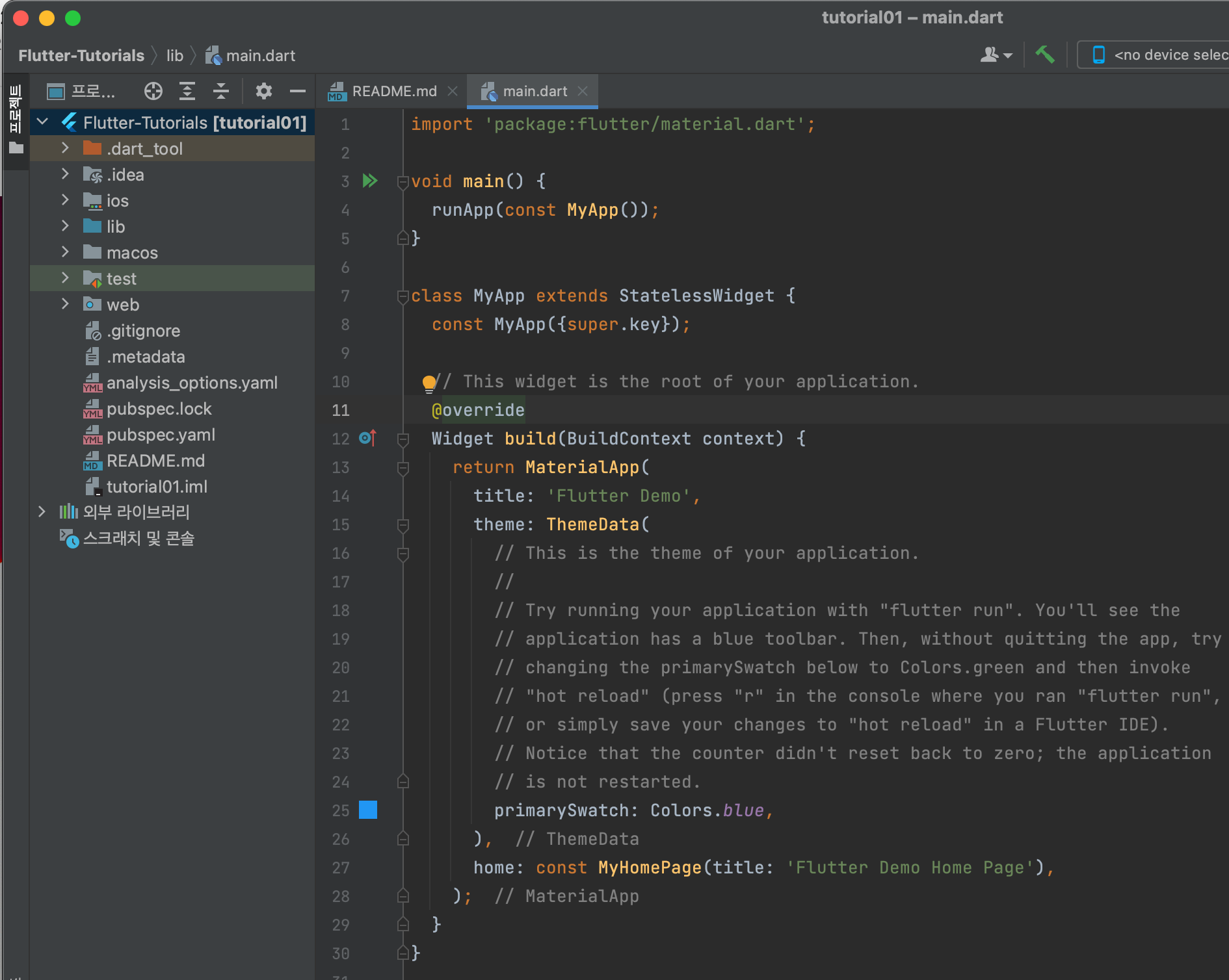 이상으로 플러터 개발 환경을 구성하고 프로젝트를 생성해보는 시간을 가졌습니다.