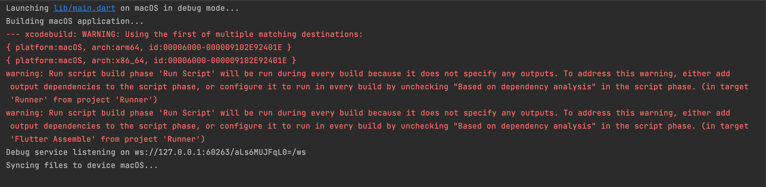 맥북 M1 을 사용하고 있다면, 분명 아래와 같이 에러를 만나게될 것입니다. 그러나, MacOS 플랫폼 환경에 대한 앱의 빌드 및 실행에는 아무 문제가 없습니다. Warning 메시가 거슬린다면 가벼운 마음으로 아래의 절차를 진행하면 됩니다.