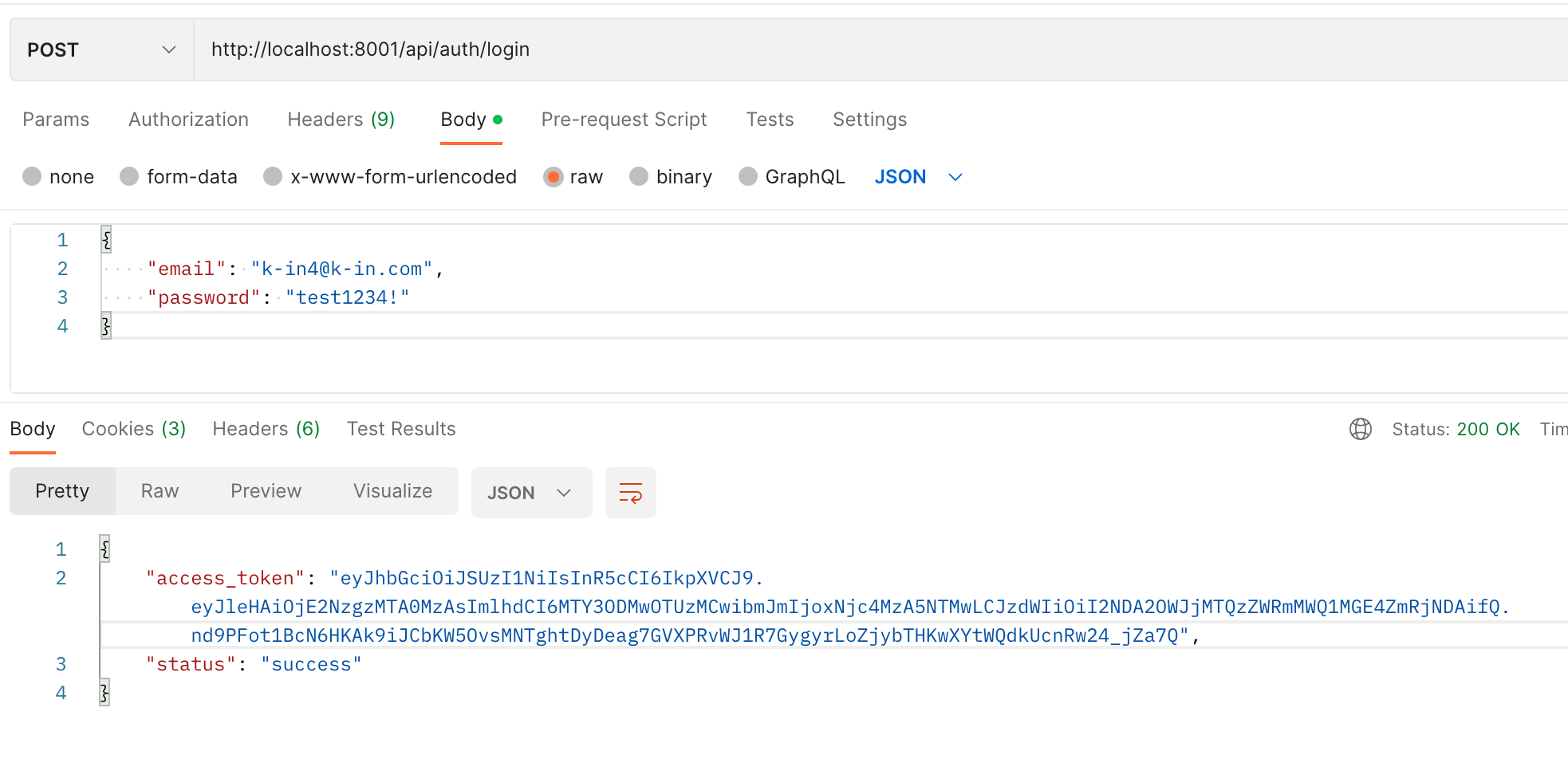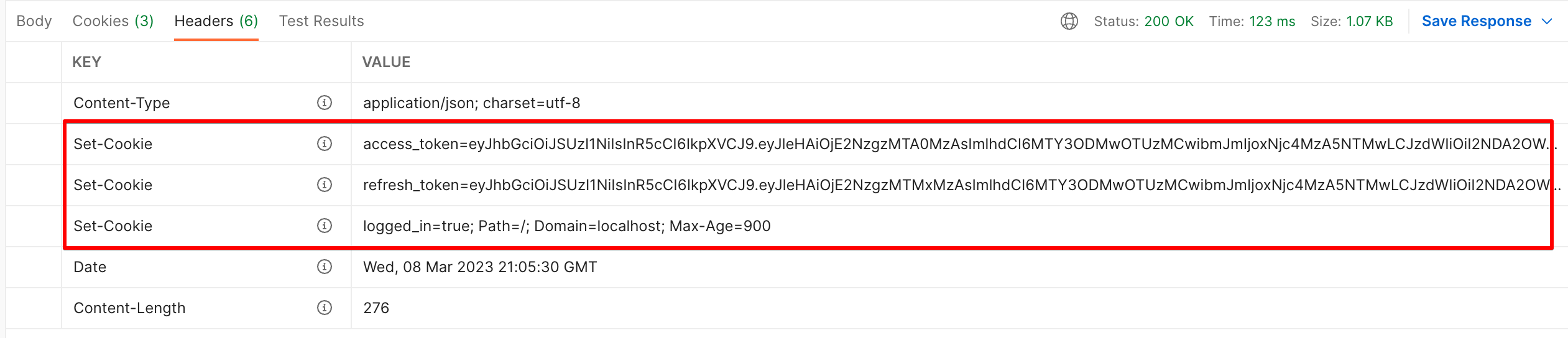 - 생성한 토큰은 Set-Cookie 헤더 응답을 통해 쿠키로 내려주고 access_token 은 별도로 응답 메시지에 출력합니다.