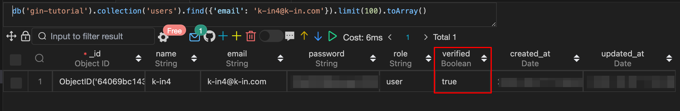 데이터 베이스에도 의도대로 verified 칼럼이 true 로 변경된 것을 확인할 수 있습니다.