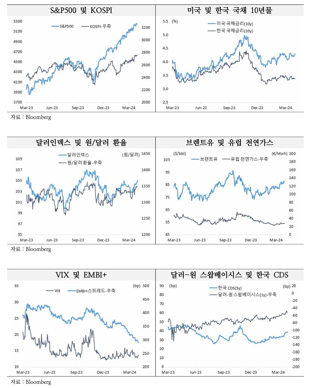 미국채 10년물 금리는 큰 폭 상승(4.31%, +11bp)하며 연초 이후 최고 수준에 근접했고, 달러화 역시 강세(DXY 104.96 +0.45%). 주가의 경우 S&P500 지수는 하락(5243.77 0.20%)했으나 나스닥 지수는 반도체 중심의 일부 기술주 강세로 소폭 상승(16,396.83 +0.11%)