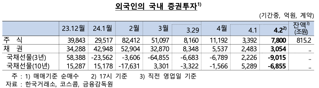 📈 외국인 증권투자 : 주식 순매수(+7,800억원*), 채권 순매수(+3,054억원**)