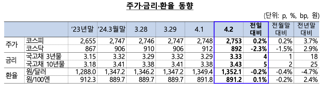 미 ISM 제조업 지수 예상치 상회*에 따른 전일 미 국채금리 움직임(2년물 +9bp, 10년물 +11bp)에 주로 영향받아 상승. 미 ISM 제조업: 24.2월 47.8 → 3월 50.3(예상 48.3)