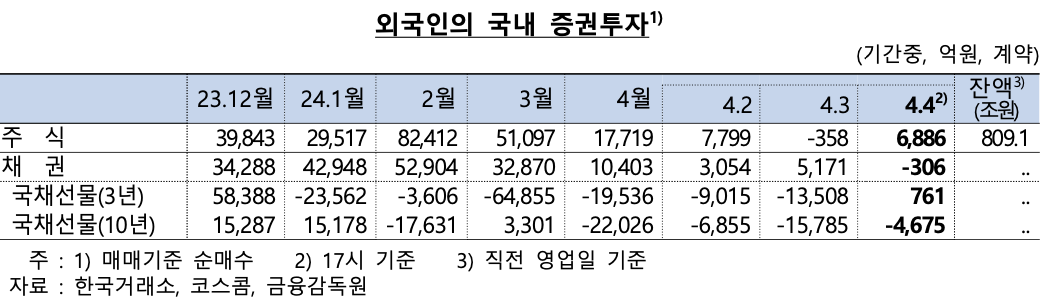 📈 외국인 증권투자 : 주식 순매수(+6,886억원*), 채권 순매도(-306억원**)