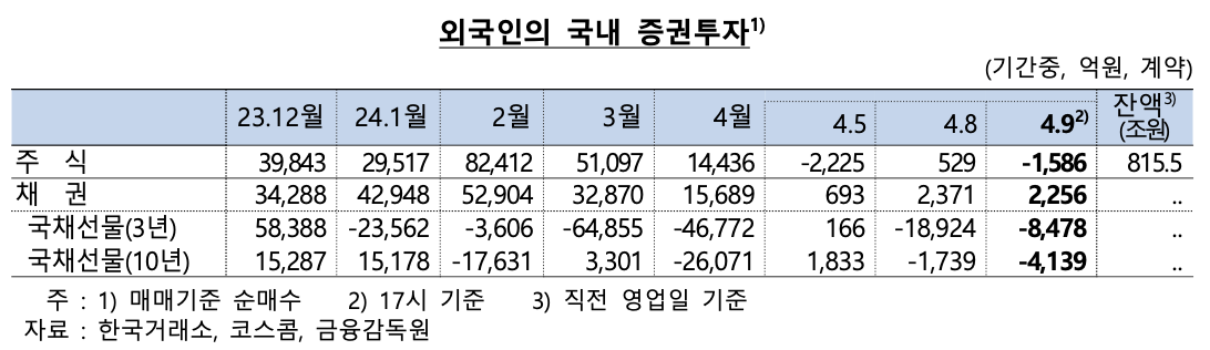 📉 📈 외국인 증권투자 : 주식 순매도(-1,586억원*), 채권 순매수(+2,256억원**)