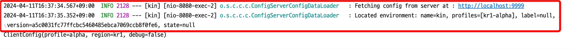 다음으로 어플리케이션 속성(application.properties)에 Config Server의 주소를 설정합니다. 이때 미리 등록해놓은 kin-kr1-alpha.yaml 파일의 어플리케이션 이름과 프로파일 설정의 이름이 동일해야 합니다. 만약 그렇지 않다면 Config Client 서버는 앱 실행 시 에러가 발생합니다. optional 설정은 만약 Config Server 와 통신에 실패했을 때 앱이 종료되지 않고 실행되도록 합니다. 하지만 이 예시에서 ClientConfig 를 Autowired 로 설정하므로 앱은 에러가 발생하면서 종료됩니다.
