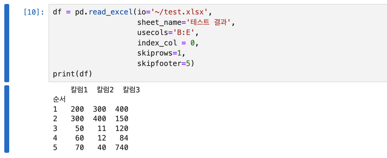 옵션을 보겠습니다. io 옵션은 파일의 경로를 지정합니다. sheet_name은 읽어올 시트의 이름입니다. usecols 는 어떤 칼럼을 불러올지를 정합니다. B열에서 E열까지 범위를 지정합니다. 다음으로 데이터에서 인덱스를 어떤 칼럼으로 할지를 결정합니다. 예시 파일의 "순서" 칼럼을 지정하므로 0번째 칼럼으로 지정합니다. skiprows 칼럼은 불필요한 행을 건너뛰고 읽어오도록 지정합니다. skipfooter 는 불필요한 다섯개 행을 제외하라는 의미입니다.
