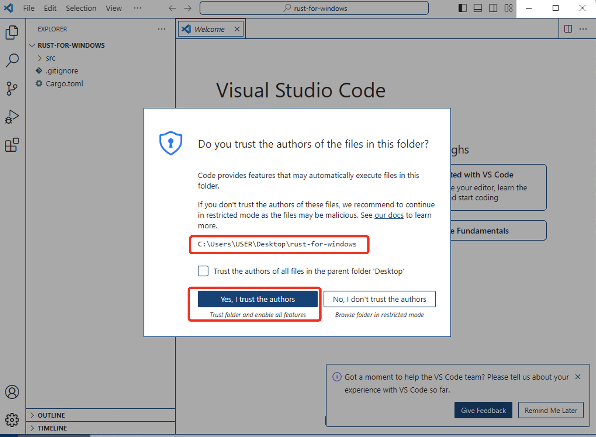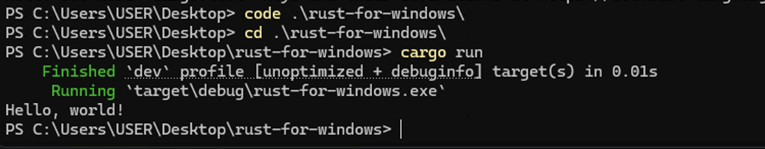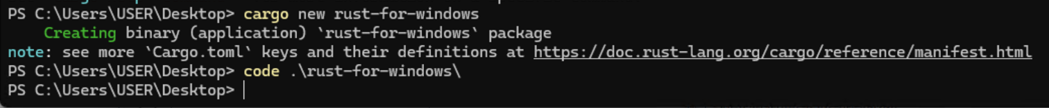 cargo new [프로젝트 이름] 명령을 입력하면 폴더가 생성되고 기본적인 프로젝트 구조가 만들어집니다. code 명령어는 vscode 를 지시하는 명령어 입니다. code .\rust-for-windows\ 명령어를 통해 개발 IDE 를 실행할 수 있습니다.