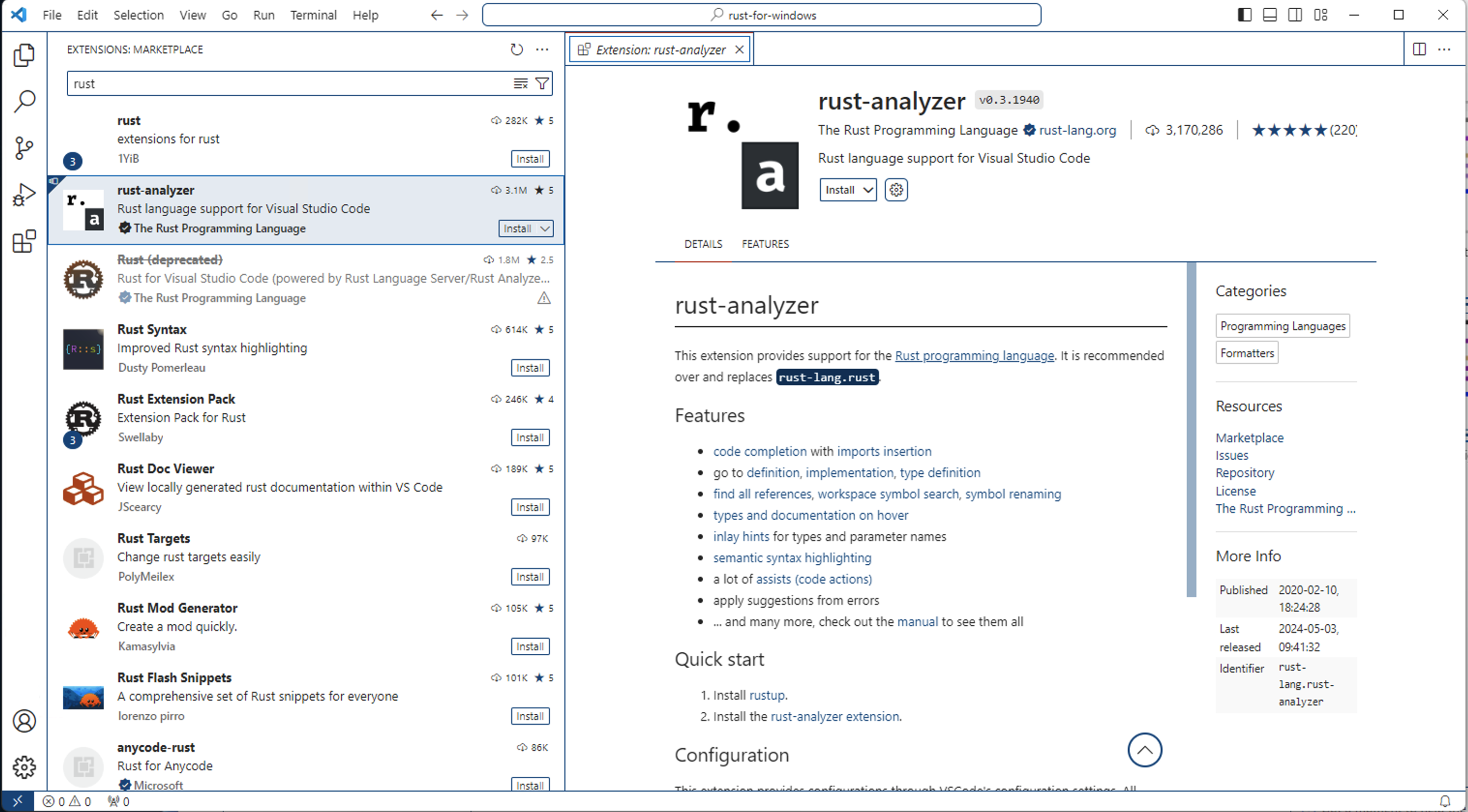 러스트를 위한 vscode 플러그인 설치, rust-anlayzer 확장도구