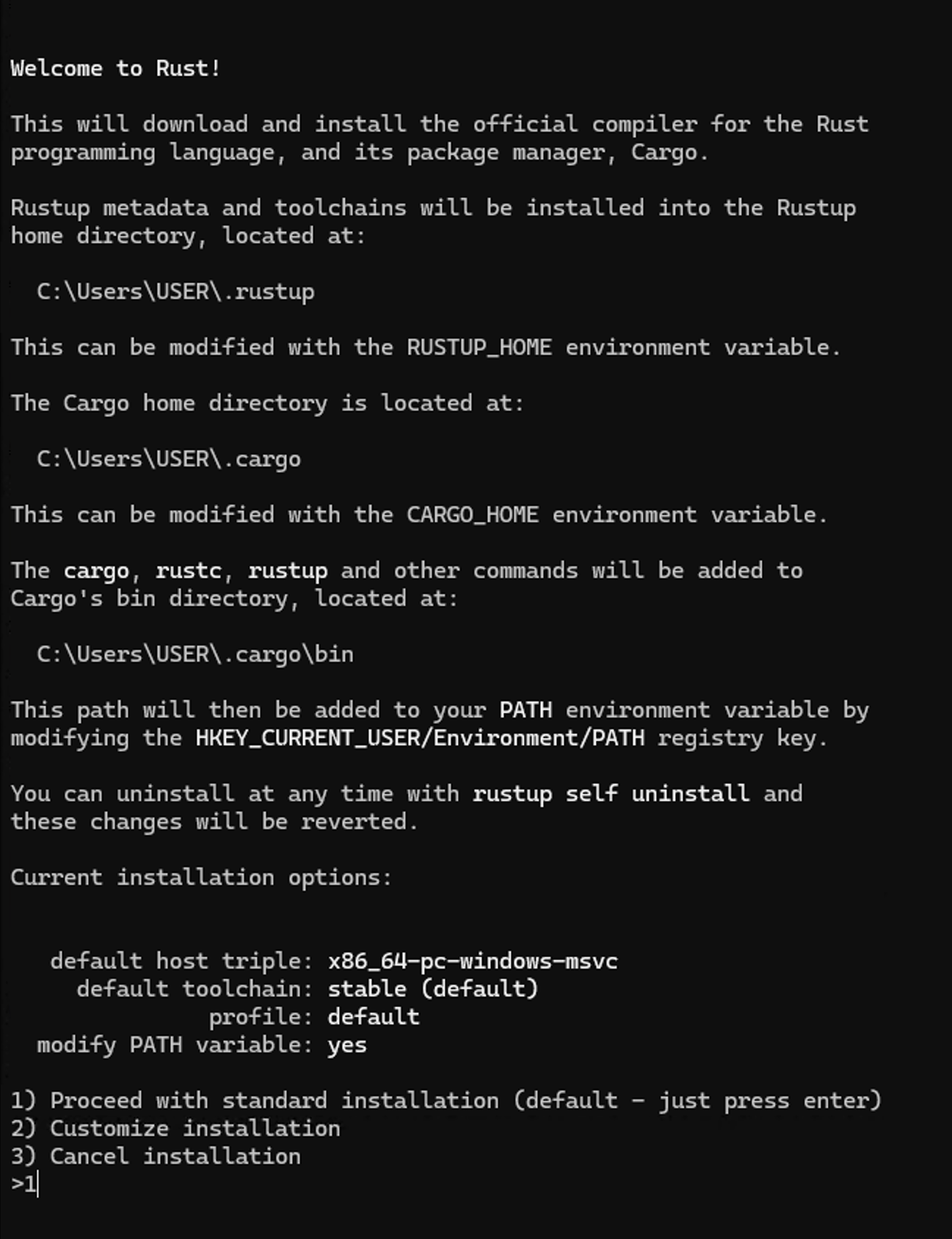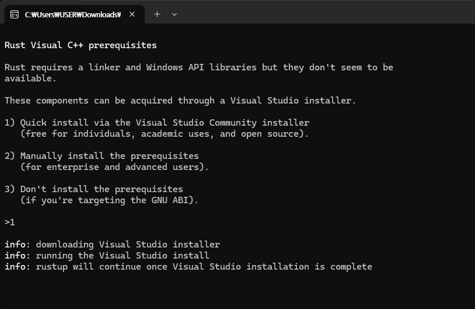 Visual Studio Installer 설치가 완료되었다면 설치 화면의 닫기 버튼을 클릭하여 Rust 가 설치 단계로 진행할 수 있도록 해야합니다. 닫기를 클릭하면 프롬프트 화면은 설치가 완료된 것을 감지하고 러스트 언어를 위한 컴파일러 설치 단계로 진입합니다. 러스트가 설치되는 위치와 역할은 다음을 참고해주세요.
