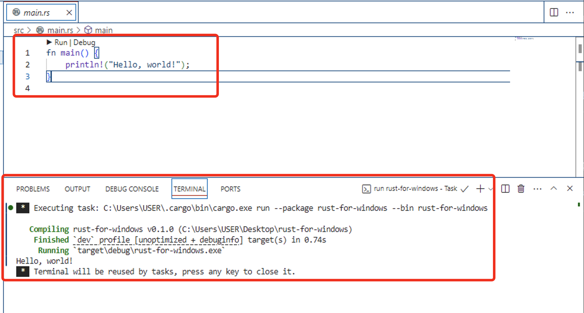 rust-analyzer 를 설치하면 main 함수에서 Run 과 Debug 를 실행할 수 있도록 출력됩니다. Debug 명령을 선택하면 Debugger 확장도구를 설치하라고 안내가 출력됩니다. 이는 나중에 다루겠습니다. 우선 Run 명령을 마우스로 클릭합니다. 클릭과 동시에 실행되어 Hello, world! 메시지가 정상적으로 출력됨을 확인할 수 있습니다.