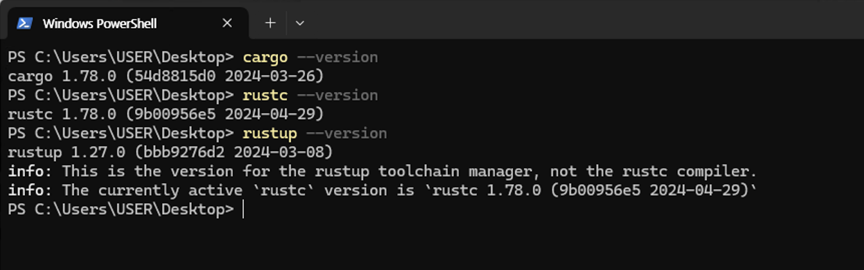 - Rustup 을 위한 메타데이터와 툴체인(toolchains) 가 설치되는 경로: C:\Users\USER\.rustup