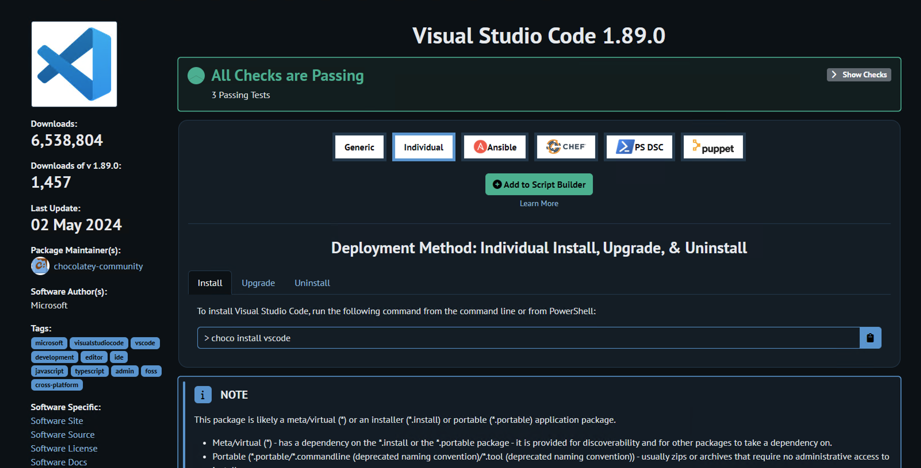 chocolatey 를 잘 설치했다면 패키지 검색을 통해 vscode 를 다운받을 수 있습니다. choco install vscode 를 통해서 vscode 를 손쉽게 설치할 수 있습니다.