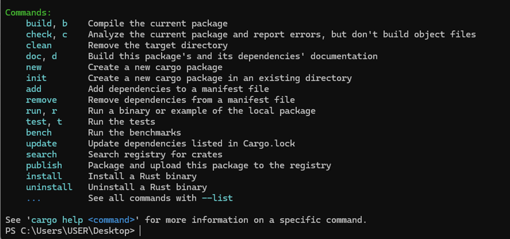 cargo 는 패키지를 설치 및 프로젝트를 생성하는 등 러스트 개발을 위한 필수적인 유틸리티입니다. cargo 명령어를 이용해서 rust-for-windows 프로젝트를 생성해보겠습니다. cargo 는 다양한 명령어를 지원합니다. 시스템 프롬프트 창에서 cargo 명령어를 입력하면 여러분이 사용 가능한 명령어들을 나열하고 설명합니다.