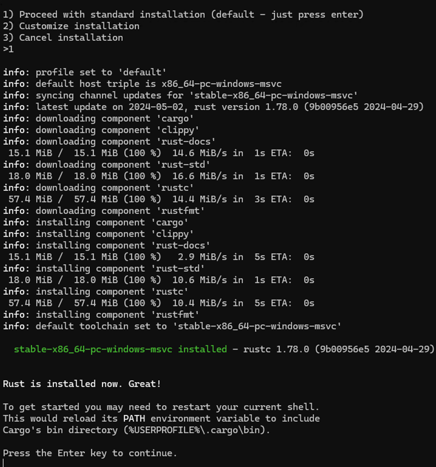 1번을 선택하거나 엔터를 누르면 기본 설치모드로 동작합니다. 설치 과정이 완료되면 어떤 버전이 설치되었는지를 상세하게 안내해줍니다. 이 글을 쓰는 시점에 stable 채널 Release 버전은 1.78.0 입니다.