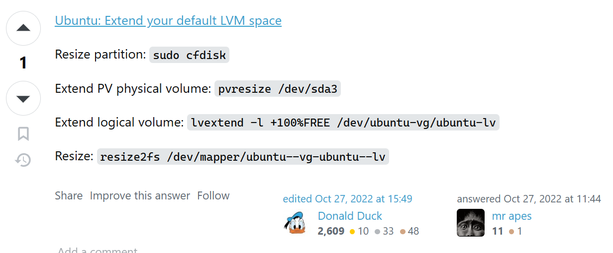 인터넷을 검색하면 cfdisk 및 pvresize 등의 명령어를 사용하라고 가이드합니다. 하지만 LVM 을 써야하는 등의 파티션 관리가 복잡해지므로 우리가 원하는 방법이 아닙니다. 우리는 단순히 디스크 공간만 확장하고 복잡한 LVM 설정을 신경쓰고 싶지 않습니다.