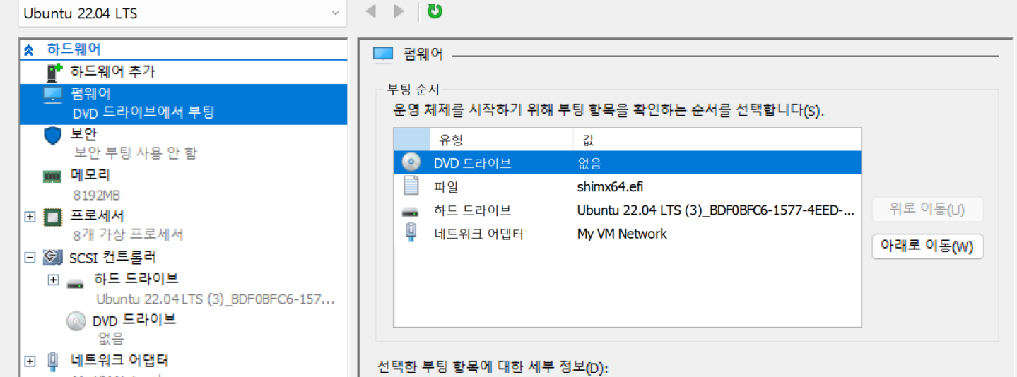 2. Hyper-V 관리자를 통해 부팅 순서를 DVD가 제일 위에 오도록 변경합니다.