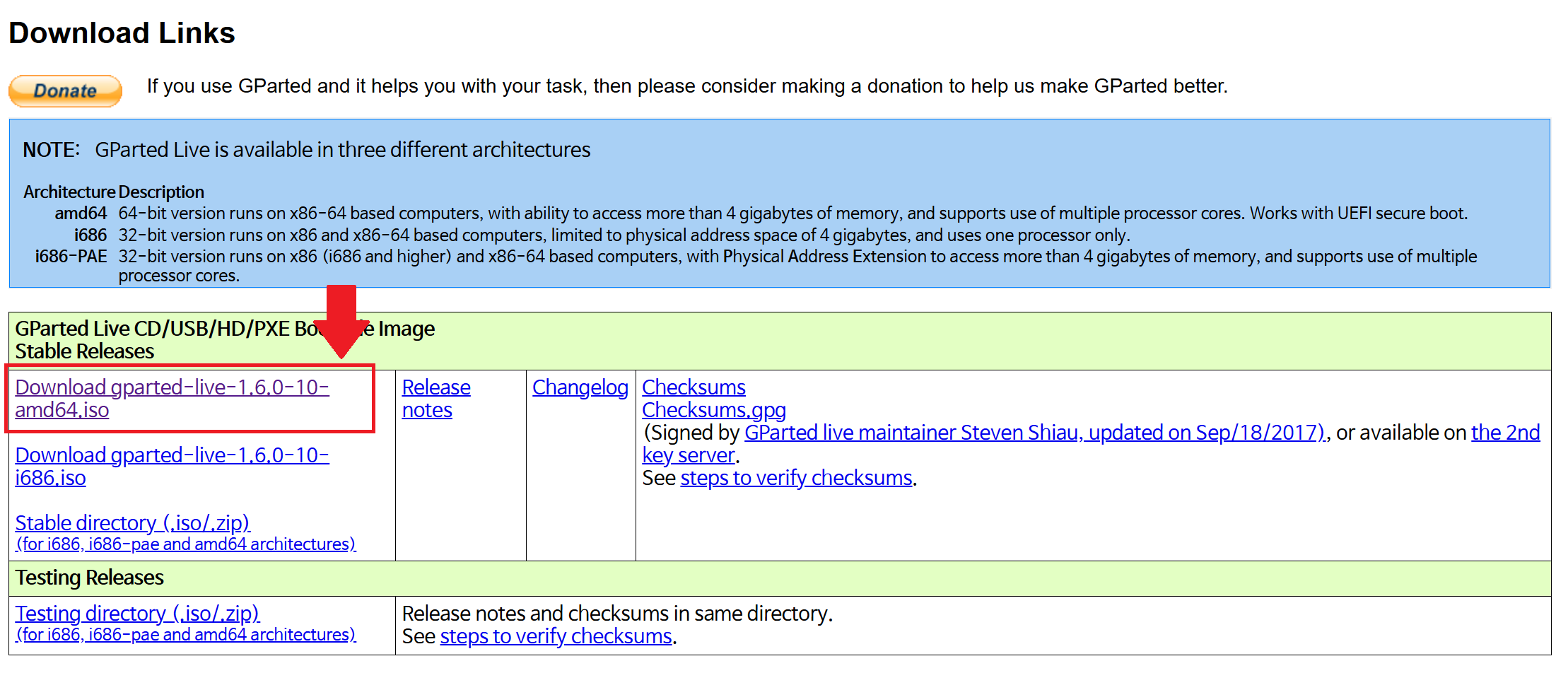 1. gparted.org 사이트에 접속하여 iso 이미지를 다운로드 받음(amd64.iso 라고 적힌 파일을 받습니다)