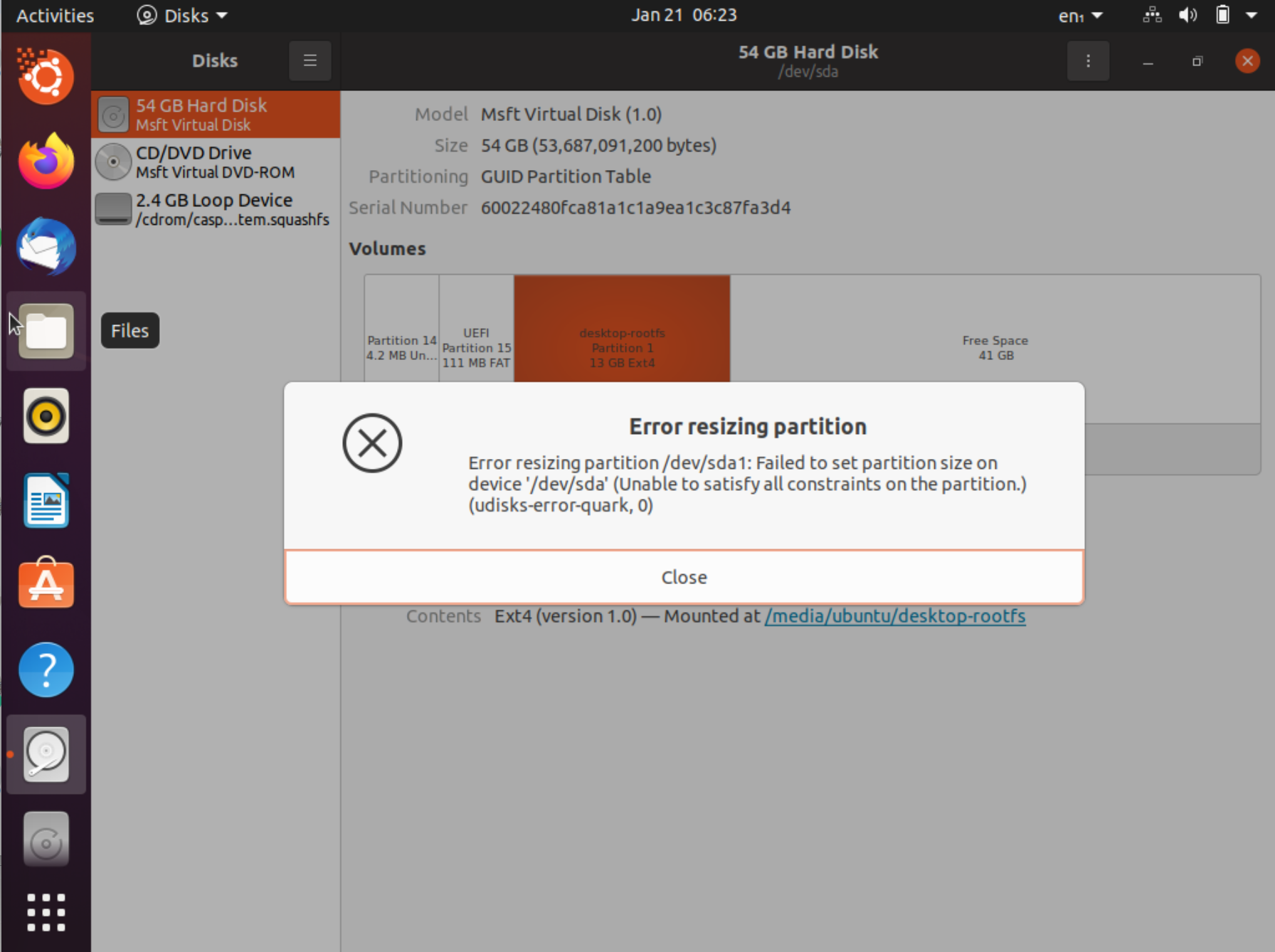 우분투 운영체제가 제공하는 Disk Utility 를 통해 /dev/sda1 파티션의 크기를 resize 할 수 있습니다. 하지만, Hyper-V 환경에서는 아래와 같은 Error resizing partition 이라는 에러가 발생합니다.