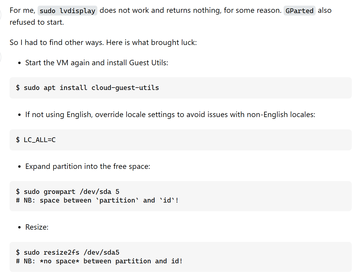 가장 좋은 방법입니다. 설치도 간단하고 명령어 순서도 간단합니다. 하지만 가장 중요한 점은 우리가 우분투의 용량을 신경쓸 때는 이미 디스크가 100% 가득 차 있는 상황일 것입니다. 순도 100% 경험담입니다. 이때는 apt 명령어를 통해 cloud-guest-utils 방법을 사용하고 싶어도 설치가 되지 않습니다.