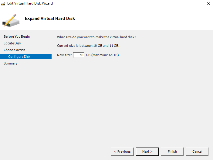 Hyper-V 의 빨리 만들기의 문제점은 우분투 운영체제의 디스크 용량을 작게 잡는다는 점입니다. 아마 이 글을 보고 계신분들은 df -h 명령어를 통해서 확인해보면 루트 경로에 12~13 GB가 할당된 것을 알 수 있습니다. 이는 디스크 용량을 50 또는 100GB로 늘려도 동일합니다. Hyper-V 관리자에서 가상 컴퓨터의 설정을 통해 하드 디스크 속성을 편집하여 크기를 40GB 로 늘릴 수 있습니다.