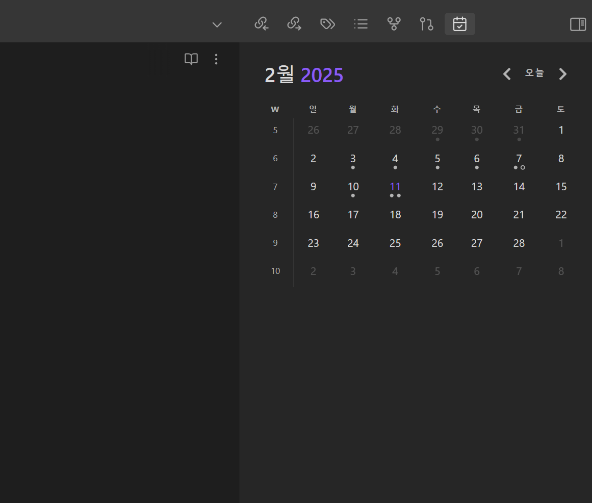 캘린더 플러그인은 아주 간단한 도구입니다. 설치하면 오른쪽에 캘린더 UI를 그려줍니다. 각 날짜 아래에는 작은 점이 표기되는데 이것은 내가 그날 쓴 글입니다. 이를 통해 매일 매일 글쓰기를 실천했는지를 알 수 있습니다.