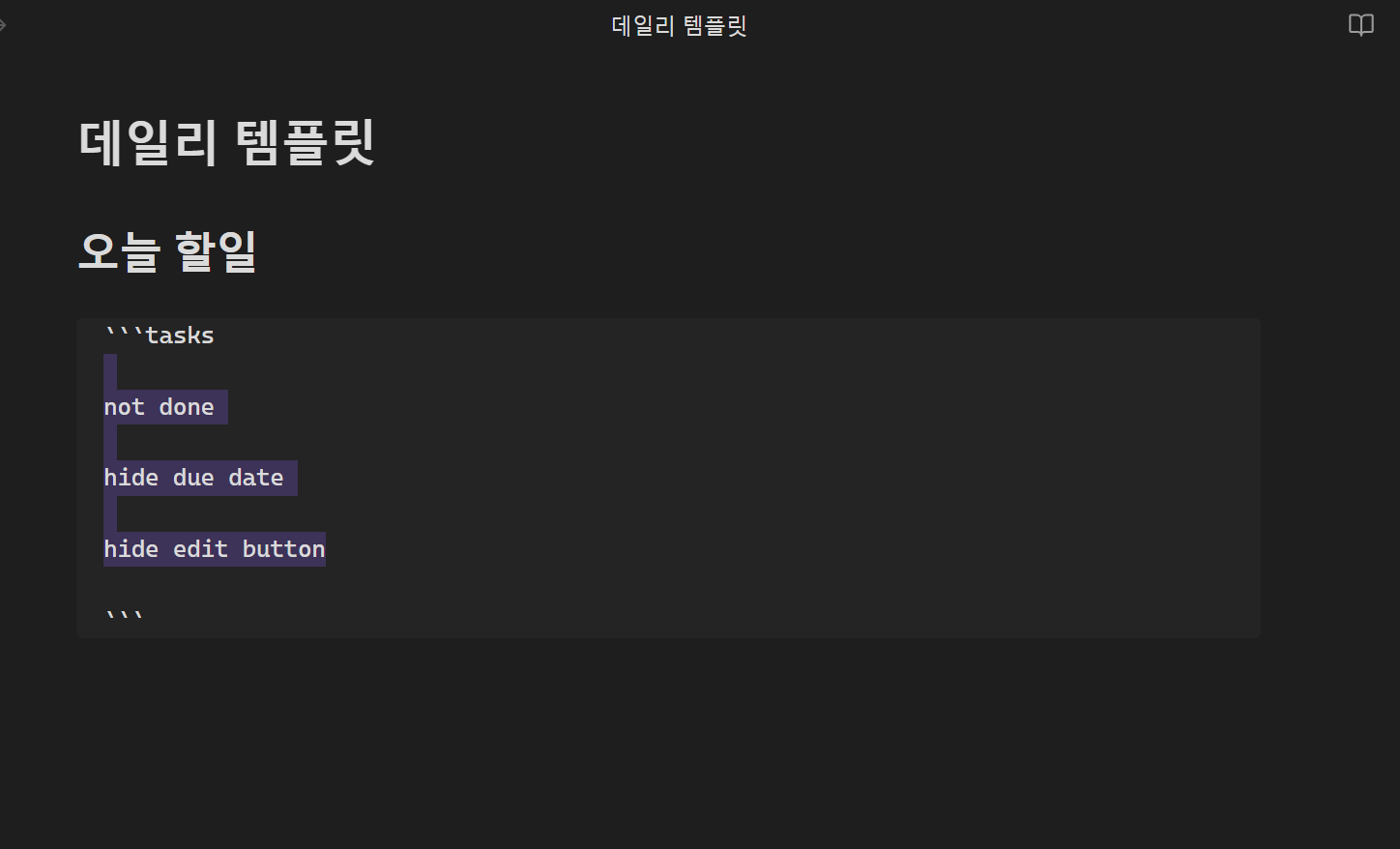 | 숨김 옵션 | hide edit button hide backlink hide done date hide due date hide recurrence rule hide task count |