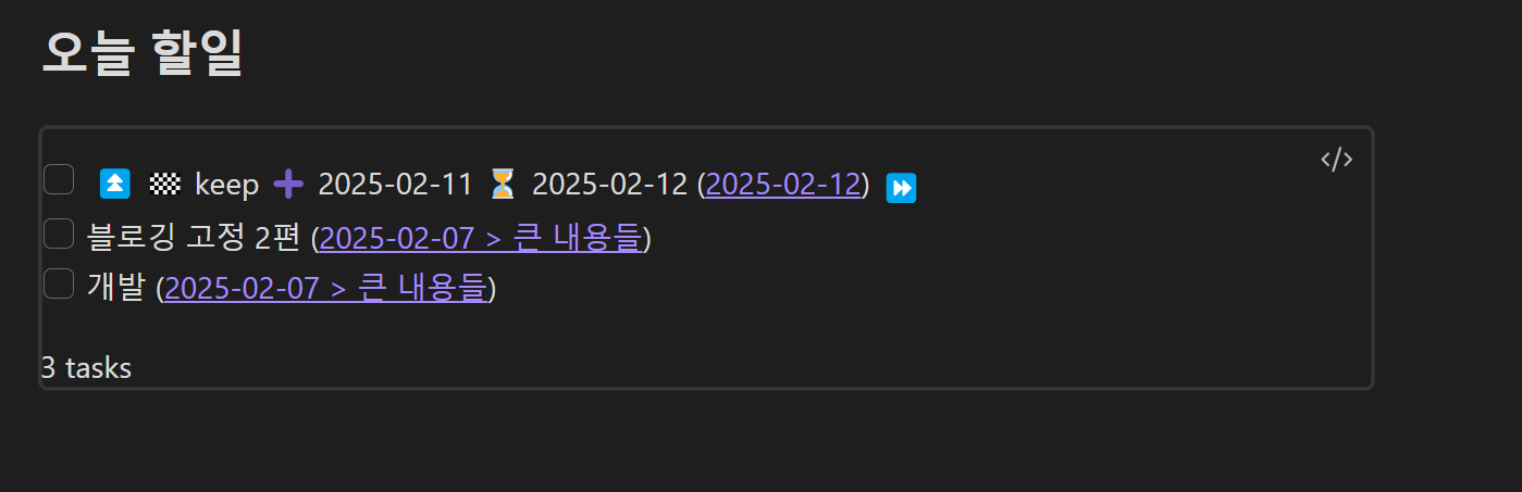 실제로 Tasks 쿼리가 렌더링되면 아래와 같이 상호 작용이 가능한 위젯처럼 동작합니다. 이제 데일리 노트를 작성할 때 이 템플릿에 따라서 생성된다면 항상 내가 놓친 작업이 없는지 확인할 수 있습니다.