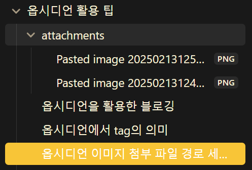 옵시디언은 붙여넣기를 할 때 클립보드에 저장된 이미지를 불러와 자동으로 Pasted image ..... 와 같은 이름으로 붙여넣습니다. 이때 항상 최상단 경로에 이미지를 붙여넣어 폴더 관리가 복잡해지는 경우가 있습니다. 이럴 때 설정에서 "파일 및 링크"에 접근하여 이미지가 놓이는 위치를 세부 조정할 수 있습니다.