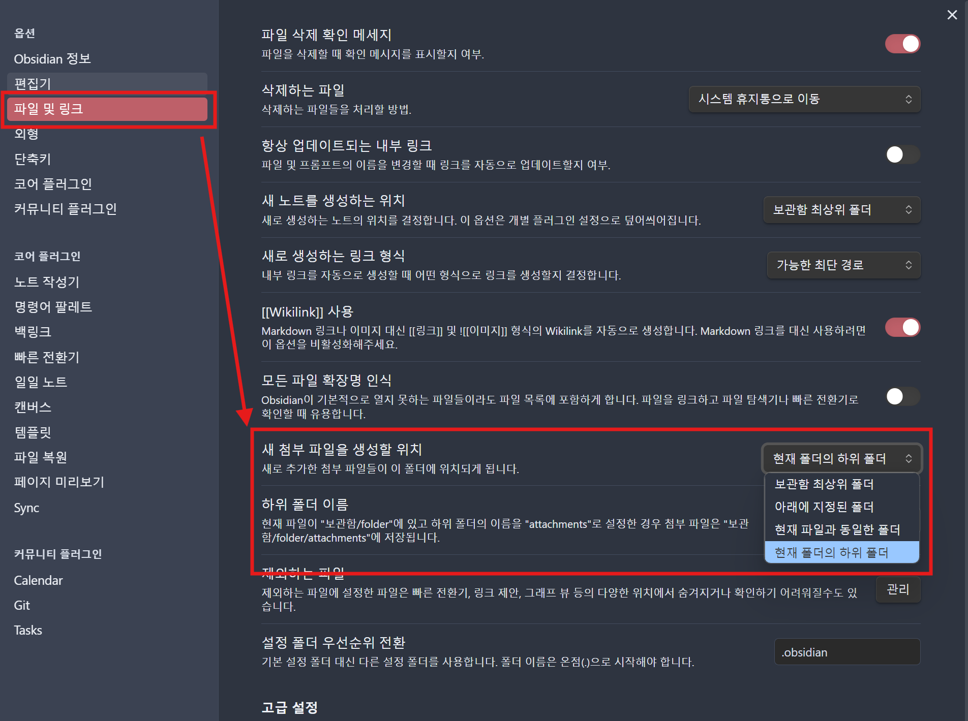 이러한 설정은 "[파일 및 링크] > [새 첨부 파일을 생성할 위치]" 에서 가능합니다. "현재 폴더의 하위 폴더"가 일반적으로 가장 적절한 설정입니다.